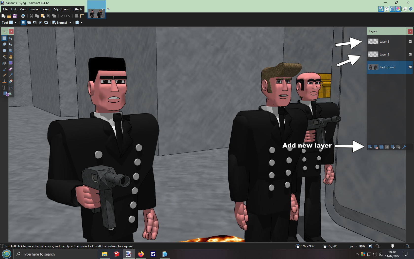 After I open the image that's going to end up as a comic panel, I create 2 new layers, the top layer for dialogue, the middle layer for the balloons. The image I opened is the bottom "Background" layer.