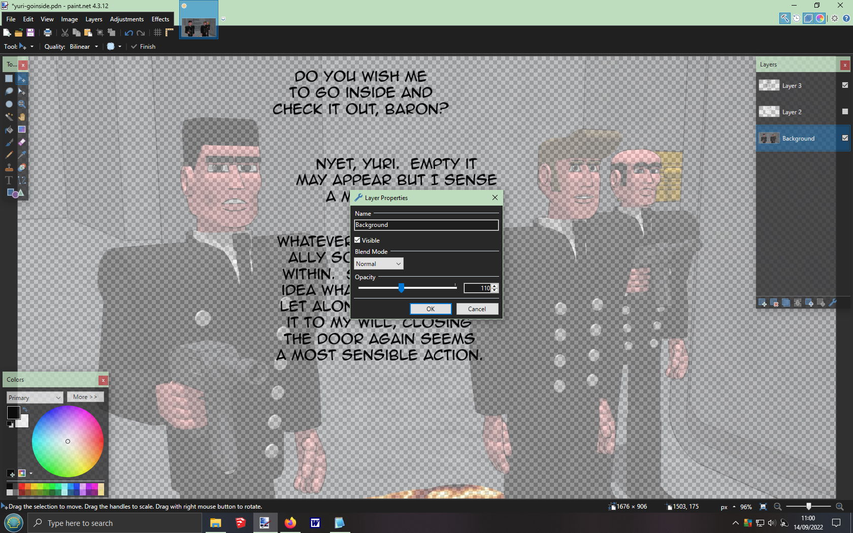 I add the dialogue on the top layer, lowering the Background layer's opacity (so it becomes semi-transparent) if the text is hard to read on top of dark colors in the image. Double-click on the Background layer in the Layer toolbox to see the layer properties, e.g.
