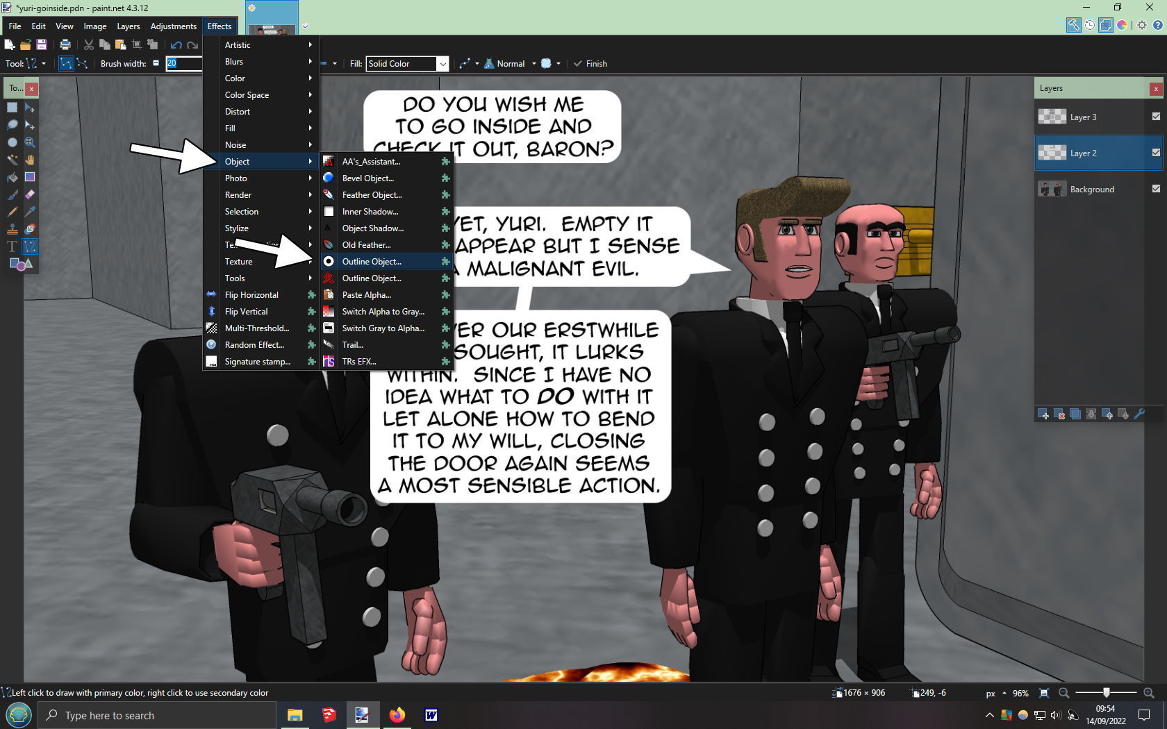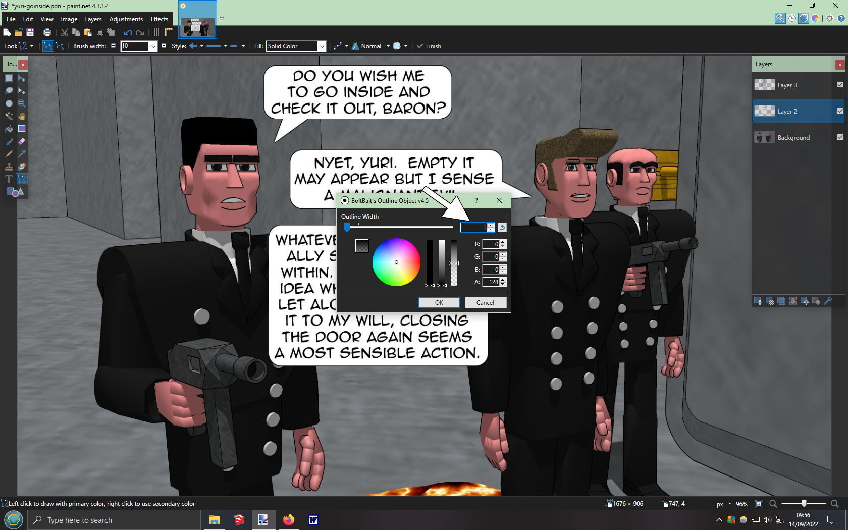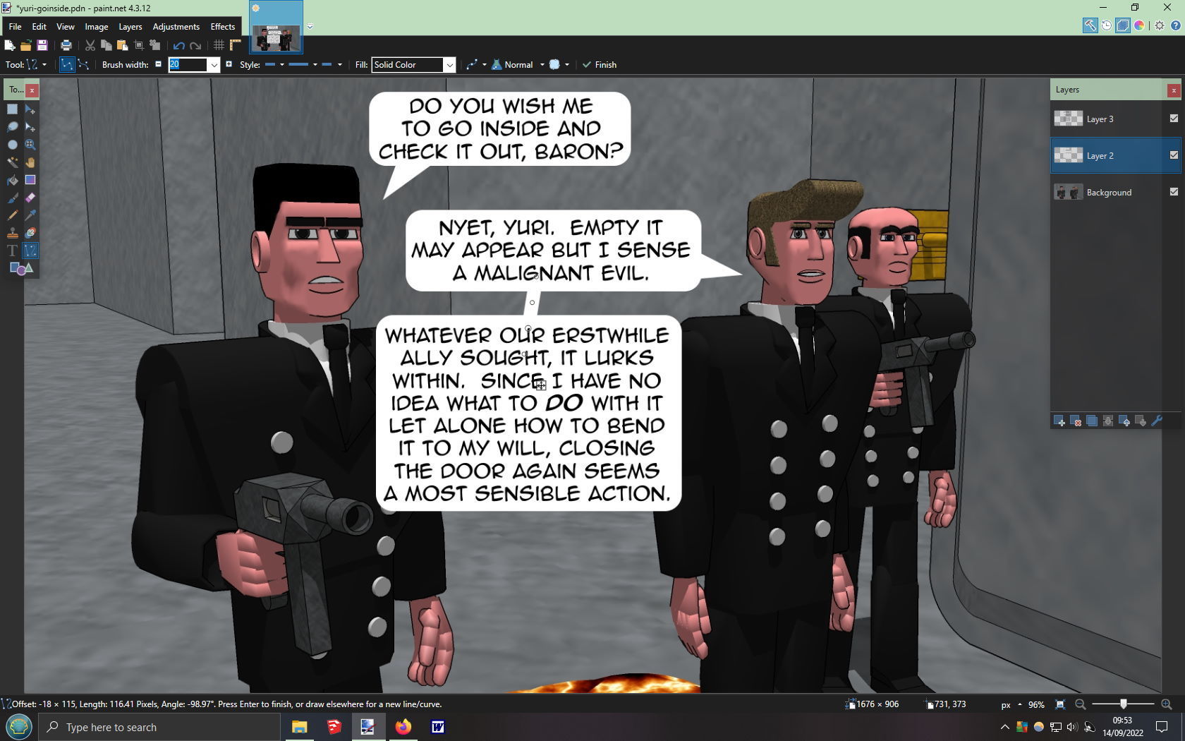 Okay, the balloons: I've set the corner radius for rounded rectangles to 20px as default, you can adjust this size manually as you go, or set it permanently in Settings (the little cogwheel on the top right) or just stick with Paint.NET's default 10px radius. (Sharp corner rectangles are for robot dialogue, if you ask me, not that anyone's asking me. But I have comics with robots in them, so that's how I do it. If you prefer sharp corners, go you.)