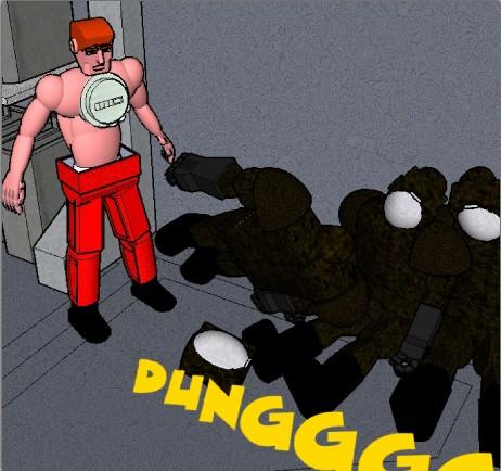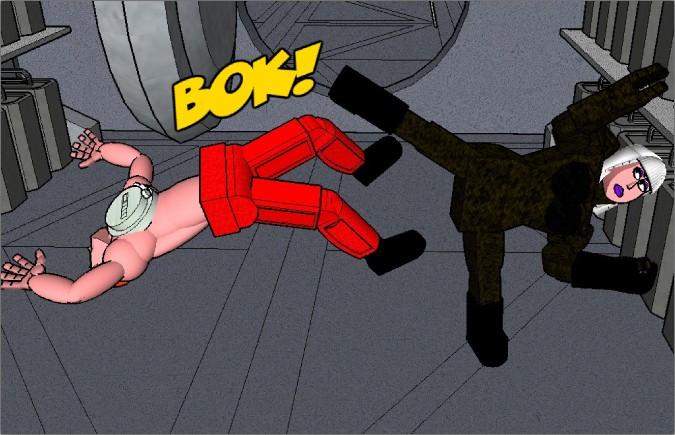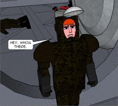 | Continuity Fail Dept.: I must've opened a slightly older location model containing the standing row of empty p-suits, intact, before Zhada (that's her name BTW) blitzed them with her blaster, thinking Ginger was hiding in one of them. I could fix it before anyone notices... or leave it as a monument to head-slapping carelessness. -dp |