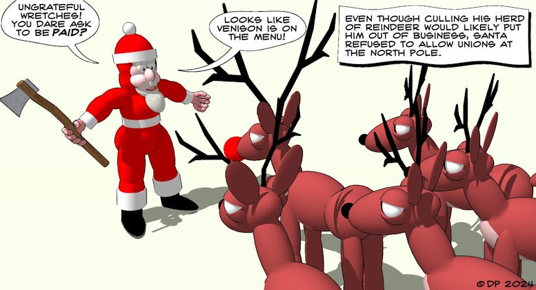 DEATH COMES TO THE NORTH POLE FADE IN INT. ENTRY HALL - DAY At one end, the outside world, a snowy landscape. A whistling, cold wind blows. At the other end, a store room containing a big sled, loaded with bulky sacks. Hanging from wall hooks are a dozen leather harnesses. An ELF comes running inside, clearly terrified, clearly being chased by something. He stumbles and staggers. LOUD HOOFBEATS. SNORTING. A HUGE SHADOW blots out the light from the outside world. The Elf spins round to face what's coming, he opens his mouth to SCREAM-- Cut away from the doomed Elf, RED BLOOD spatters the hall as SWISHING, SLASHING SOUNDS, as if from multiple blades, play over the Elf's YELPS. INT. STUDY - DAY The BIG JOLLY BEARDED MAN whose name must not be spoken aloud lest he adds you to his naughty list, sits at his desk, which is piled with yellow scrolls. He dips a feather quill into an ink pot and writes on one of the scrolls. BIG JOLLY BEARDED MAN Refused to help his mother with chores... called his little sister names... Oh, dear. Definitely a lump of coal for you, you little shit. Something, perhaps a noise, makes the Big Man stop writing and turn to look at the door. Just at that moment the door opens and another Elf bows from the waist. His name is BOB. BIG JOLLY BEARDED MAN I told you I was not to be-- BOB My lord! There's something happening out there! One should perhaps pause for a moment to describe Bob. He has a pale complexion and has pointy ears and big blue eyes and a pointy nose. He wears a green cap, a green jacket with silver buttons, and green pants tucked into shiny black boots. All Elves look like this. BIG JOLLY BEARDED MAN If you could be more specific...? BOB Merry and Bright went outside to round up the herd. That was over an hour ago. I sent Roundbutt to see what was holding things up. The Big Man sets his quill down and stands up. He towers over Bob, a giant of a man to the smaller Elf. BIG JOLLY BEARDED MAN Spare me your exposition. Show me what is amiss. Bob nods and turns and runs off. The Big Man ducks his head through the doorway and lumbers after him. INT. LONG HALLWAY - DAY Bob scoots by. Behind him comes the Big Man, each of his long strides three times the length of Bob's. This place is built for smaller people, the Big Man has to duck constantly to avoid banging his noggin on joists and arches. There are doors along either side of the long hallway and through them we catch glimpses of clanking assembly lines, sacks are filled with toys and electronic gadgets. ELVES manning the machines look round as the Big Man passes by. Bob leads the Big Man to a doorway at the end of the long hallway. He stops there and beckons for the Big Man to stop. Bob peeks through the doorway and pulls back instantly. The Big Man, who is hunched over below the low ceiling, turns his head and listens. HOOFBEATS. SNORTING. INT. MIDDLE ROOM - DAY Looking back through the doorway, beyond which the Big Man and the Elf lurk. In this room there are many large shapes moving around, we only see their shadows, cast large upon the walls and through the doorway. More LOUD HOOFBEATS and SNORTING. UNSEEN ELF (O.S.) No, please, haven't I always been kind to you, haven't I brought you nice lichen? The SNORTING becomes angrier, if you can imagine such a thing. The unseen elf SCREAMS. And the walls are suddenly painted with blood spatter. The Big Man and Bob look at each other, horrified. INT. LONG HALLWAY - DAY The Big Man notices a big axe hanging on the wall, with a sign underneath that reads: IN CASE OF FIRE YELL LOUDLY AND CHOP YOUR WAY OUT The Big Man's huge hands reach for the big axe. INT. MIDDLE ROOM - DAY The Big Man pushes himself through the doorway, hiding the axe behind his back. The HOOFBEATS and SNORTING die away. Abrupt silence. The Big Man finds himself staring at several REINDEER. They stand in the bloody remains of the Elf who had pleaded for mercy, but received only a terrible death. Their antlers are like huge scythes, dripping gore. One of the reindeer pushes forward through the others. He has a mutant defect, his nose radiates a pulsating red light. Alas there is no room here for his tragic backstory involving his mother giving birth in the glowing ruins of an abandoned Russian nuclear facility, then sacrificing her own life to distract the hunters so her child could survive. But it also gave him the power of human speech. BIG JOLLY BEARDED MAN I should have guessed it was you. I took you in and gave you shelter, a place to live, when others treated you as an outcast. In return you have betrayed me. And have murdered my faithful Elves. RED NOSE REINDEER Don't ask us to feel sympathy for your overseers. Their cruel lash has drawn blood for the last time. We will no longer obey. BIG JOLLY BEARDED MAN And what happens tonight? The red-nosed reindeer cocks his head to one side, puzzled. RED NOSE REINDEER Tonight? BIG JOLLY BEARDED MAN Don't pretend you don't know it's the biggest night of the year, when I travel everywhere, spreading joy and peace. Without my influence, the world will descend into chaos and madness. RED NOSE REINDEER That sounds like a human problem. HOOVES STAMP and NOSTRILS SNORT, the reindeer like this! INT. LONG HALLWAY - DAY A dozen Elves from the toy assembly lines gather behind Bob, he signals to them to keep in to the sides so they won't be noticed by the reindeer in the next room. The Elves are armed with hammers, wrenches, toy soldiers with rifles fixed with bayonets. One hugs a huge teddy bear, Bob looks at him, the Elf hangs his head in shame. INT. MIDDLE ROOM - DAY The Big Man takes deep breaths, controlling his temper. BIG JOLLY BEARDED MAN I am willing to overlook your crimes and forego punishment, if you agree to pull my sled come zero hour. RED NOSE REINDEER You really believe the fate of the world depends on your flying through the sky and delivering presents to children? BIG JOLLY BEARDED MAN It's not what I believe that matters. It's what everyone els