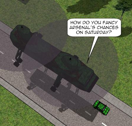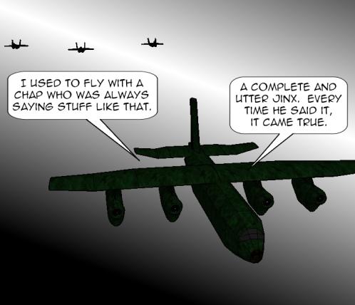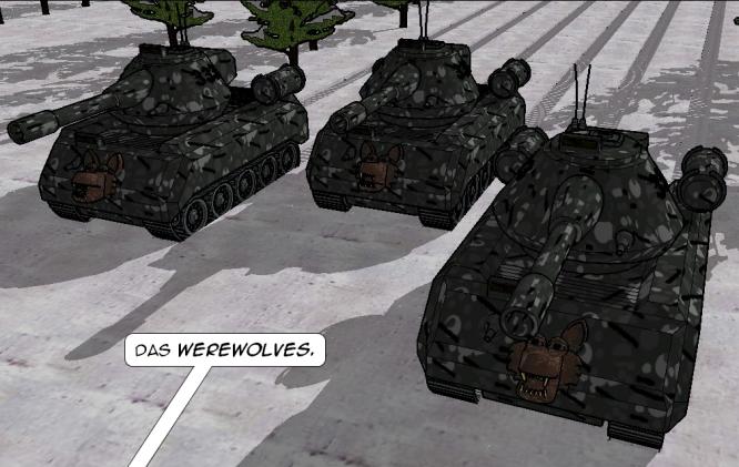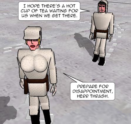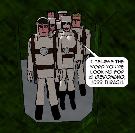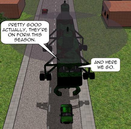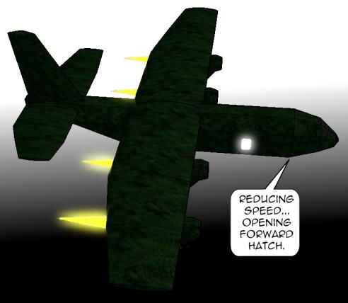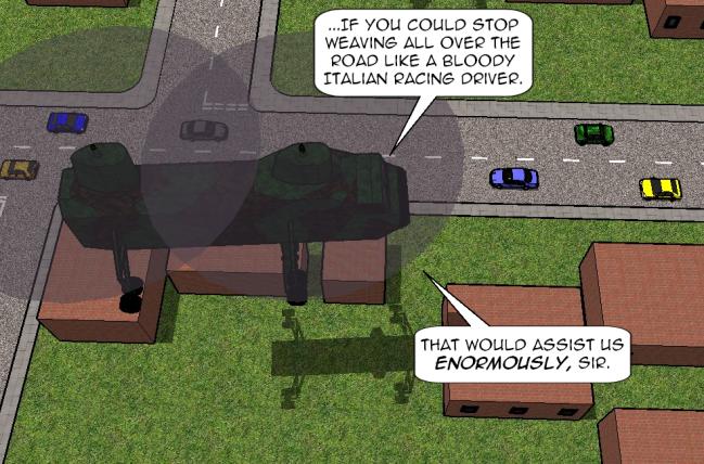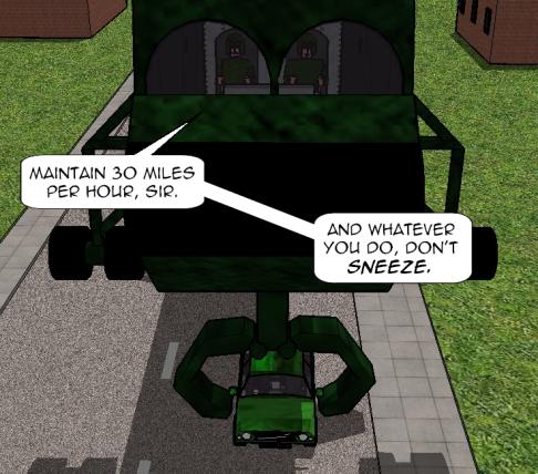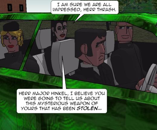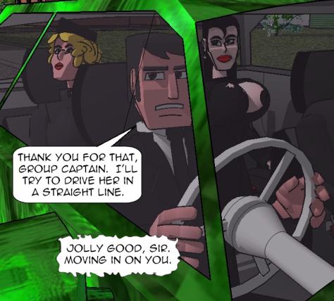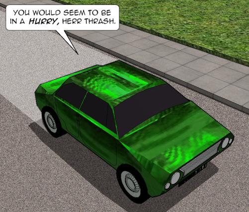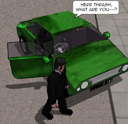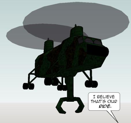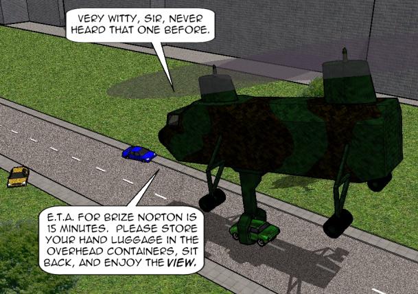 Various cars, jet fighter models and trees (!) borrowed from Sketchup's 3D Warehouse for speed, I wish I'd taken note of the authors' userids so I could give credit, apologies are offered. I tinkered together Thrash's car, the helicopter, the RAF transport plane and the tanks myself.