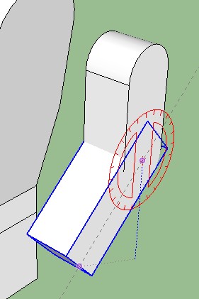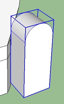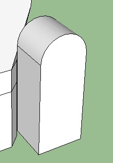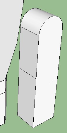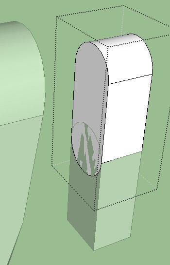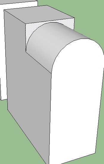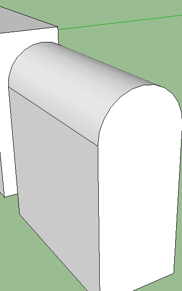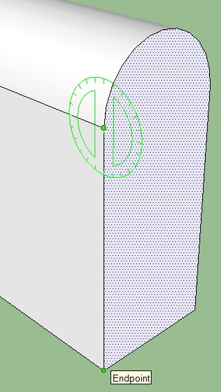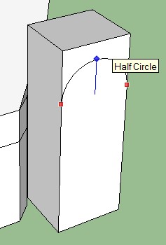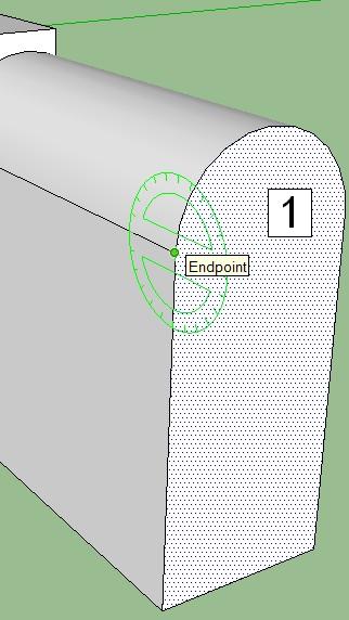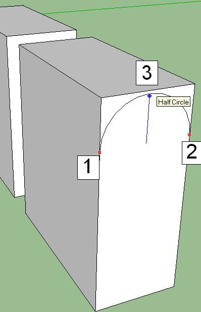 I drew an arc on the side of the rectangular prism (let's just call it "the torso" from now on -- that's what it's going to turn into). I just selected a couple of points on the torso's side, [1] and [2], then moved the mouse up until the arc reached the "half circle" point, and clicked on the torso [3] to fix the arc.