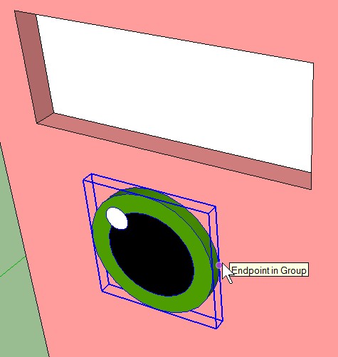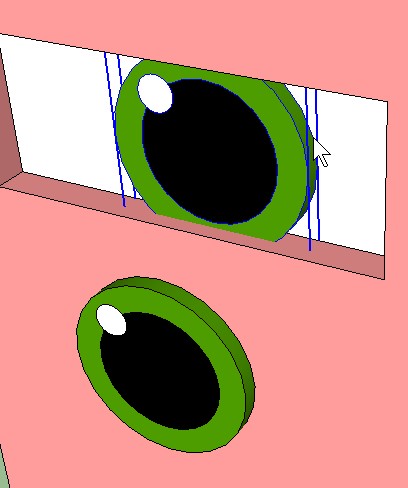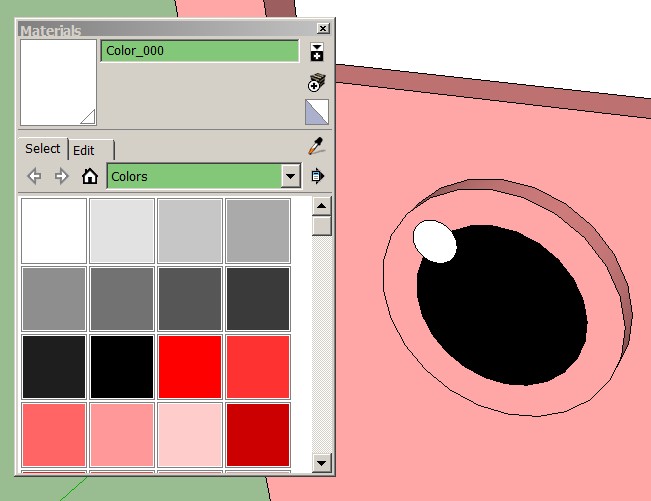 There's a reason why I didn't draw the circle directly onto the white socket area -- SketchUp would have seen a geometry overlap with the eye rectangle and split the circle, but that's not what I want, so I'm drawing the circle on a clear area and will move it once I'm finished, as you'll see. Use the Push/Pull tool