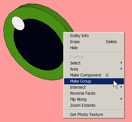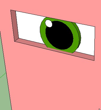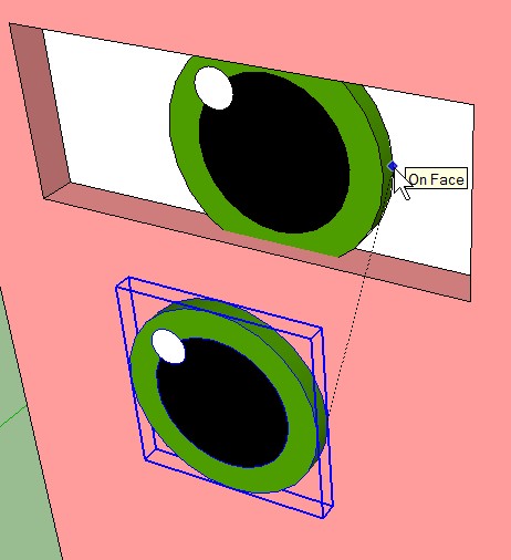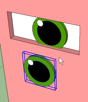 There's a reason I copied the eye rather than tried to move the original eye. For some reason, when SketchUp creates a group, this sometimes stays locked on one axis and only slides along that axis. By making a copy of the eye, which I'll now work with, I skipped past this problem. Sounds odd, but that's the best explanation I've got! Maybe it's just my version of Windows, maybe it's SketchUp, I dunno. Sanity Check -- So Far So Good
