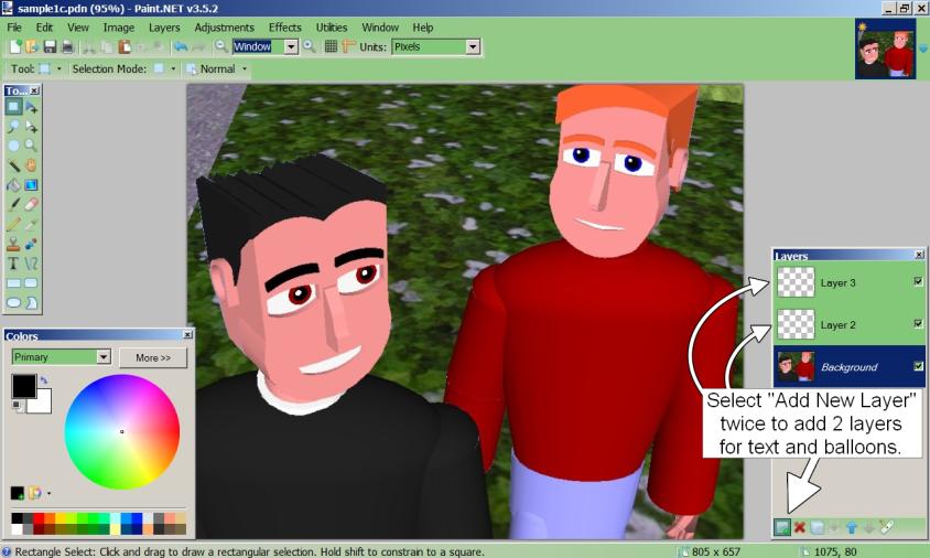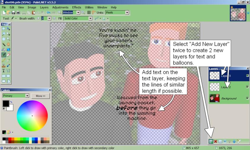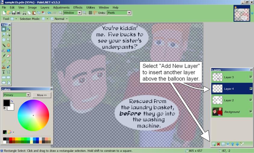 Now I could have added 3 layers at Step 2 above instead of just 2 layers, but I like to take it easy and not tax my brain too much. I concentrate on adding the text first, the balloons next, then worry about the tails last.