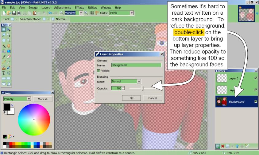 Step 3, if your background picture is too dark then reduce the opacity, which makes it easier to read text: