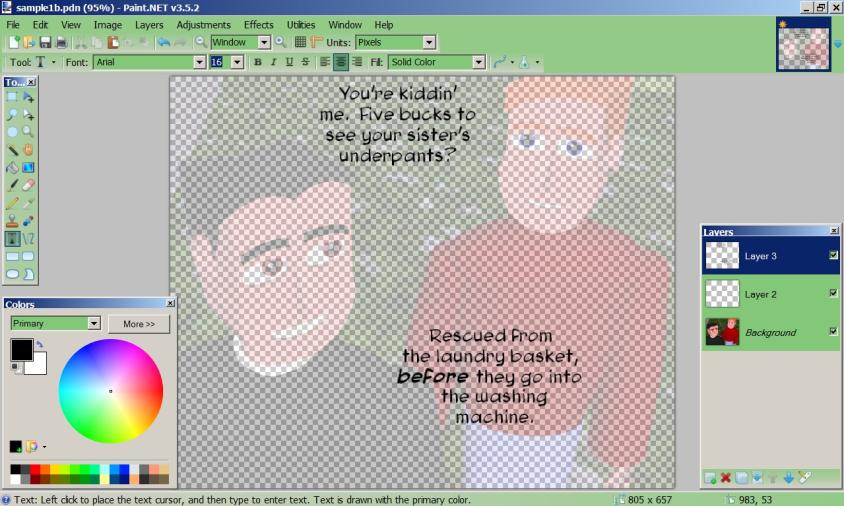 There's more than a few similarities between Paint.NET and Photoshop, some specific functions may differ but most can be duplicated, from what I've seen. (If you're trying Paint.NET for the first time, numerous effects plug-ins can found at the Paint.NET forums. I'd recommend at least downloading BoltBait's pack.)In the following example the default black and white colors will be assumed, i.e. black text on white background. Obviously you can use whatever colors you like just by selecting different colors from the palette.