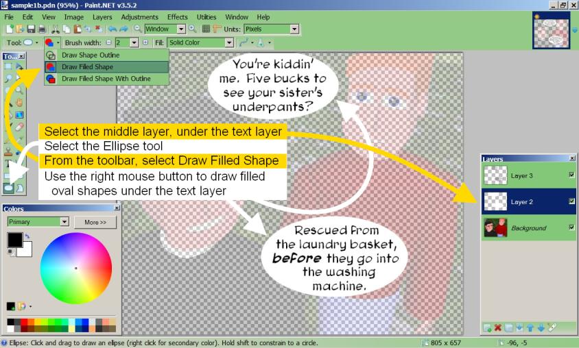 Step 5, select the middle layer and use the Ellipse tool to add balloons (using right-mouse button for white... or you can flip the colors over in the Colors tool window so white is on the left button if you prefer):
