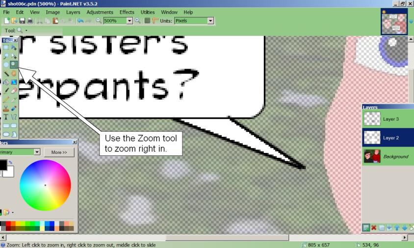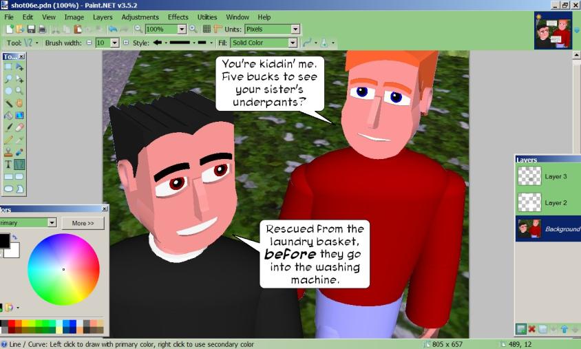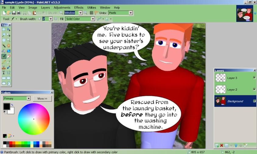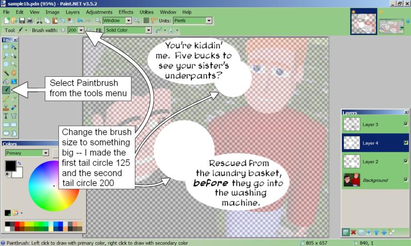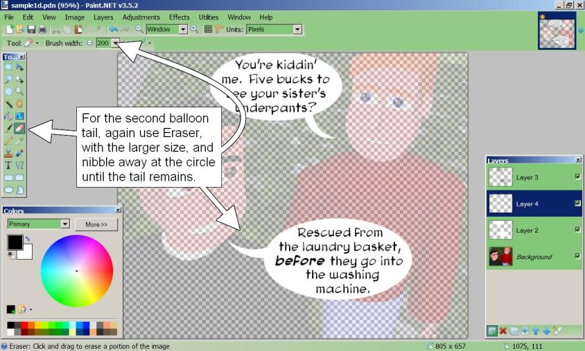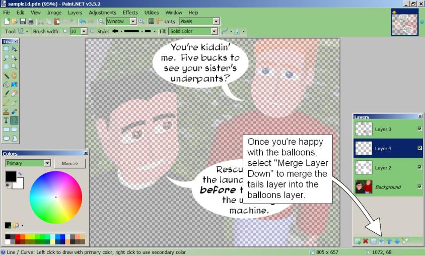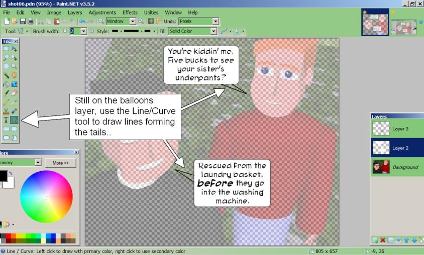 One thing I'll mention, sometimes when balloons are in close proximity to each other, it's awkward to draw tails or to nibble at them with the Eraser tool without affecting other nearby tails. When this happens I'll do them one at a time, creating a new tails layer above the balloons layer and then merging the layers when the tail is done -- and then create another new tails layer for the next balloon/tail combination. Repeat as needed.