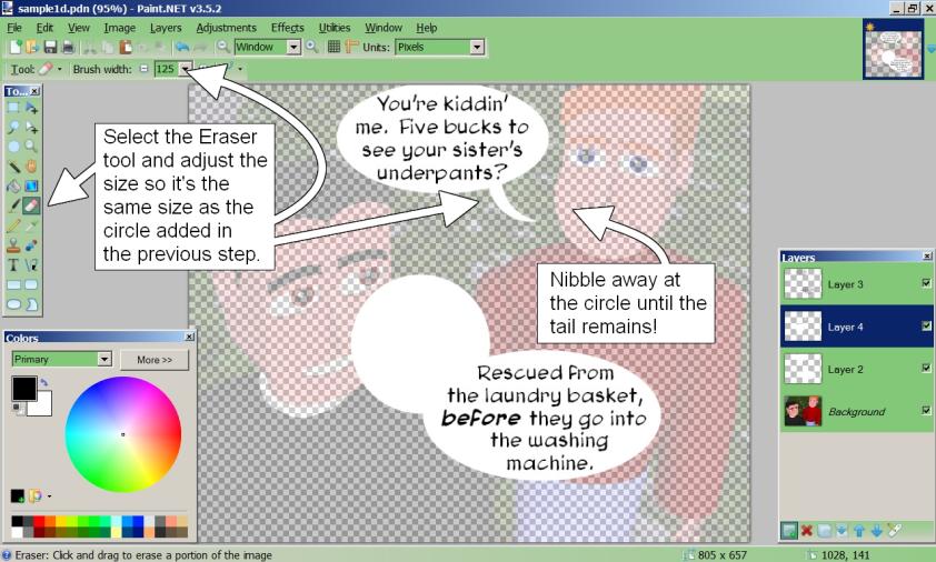 Step 5d, use the Eraser tool to trim or nibble at the circle, leaving the balloon tail: